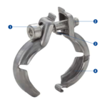 该卡箍装配快速方便。其工作原理是利用两片卡箍底部的钩状设计,实现单手装配。